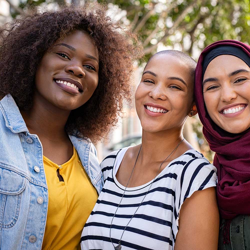 women are supporting each other. We see one woman smiling. Three sets of hands joined together in the air.